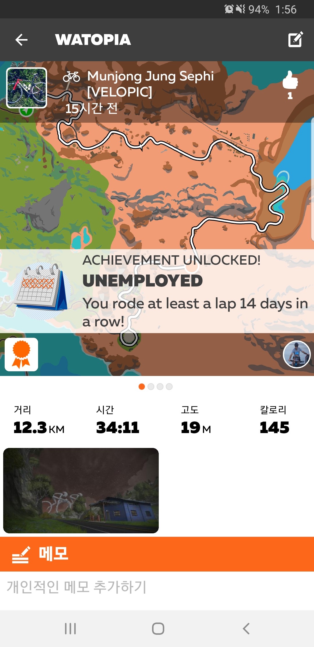 은근한 미국식 유머코드인데 14일 연속으로 즈위프트에서 자전거 라이딩을 하면 주는 뱃지의 이름은 "UNEMPLOYED" 이다. 한글판에서는 "실업자" 라고 번역되어 있지만 내 마음속으로는 "백수" 라고 번역하면 더 좋을것같다. 직업이 없는 사람이나 14일 연속으로 자전거를 탄다는 의미.